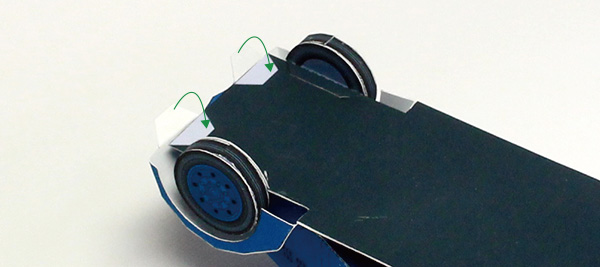 展開図の「27」を切り取って組立指定図に従って折り、下図のように接着します。2個つくります。下図の場所に接着します。反対側も同様に接着します。