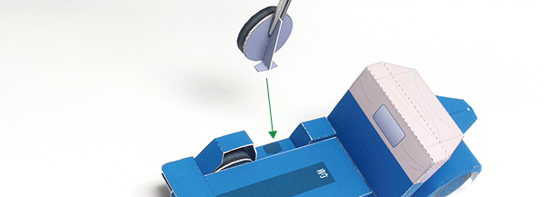 上でつくったパーツと、21でつくったパーツを下図のように接着します。タイヤの位置を変えることで積載量の表現できます。その場合は下図を参考にしてください。