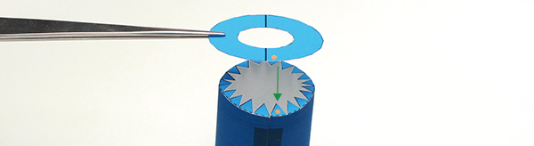 展開図の「33」を切り取って、組立指定図に従って折り、棒などに巻きつけて丸みを付けておきます。下図のように接着します。