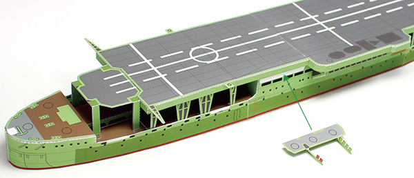 上でつくったパーツを、船体の下図の位置に、断面で接着します。前後に注意してください。