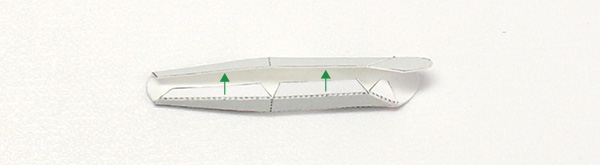 展開図の「43」を23と同じ手順で組み立てて、上でつくったパーツに接着します。矢印で示した方向が前方です。