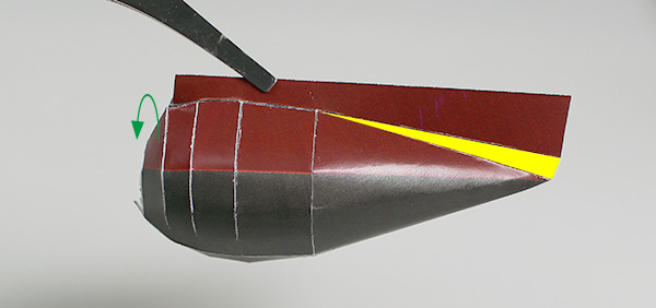 上でつくったパーツの、黄色で示した部分の裏側同士を接着します。また矢印部分ののりしろも接着します。