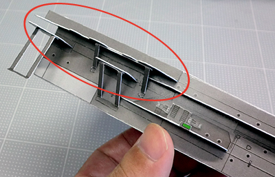 ステップ6で組んだパーツが完全に乾燥してから、赤丸部分の赤いラインにそって切り込みを入れます。ここがアンテナ支柱の差し込み位置になりますので、裏までしっかり抜き通してください。