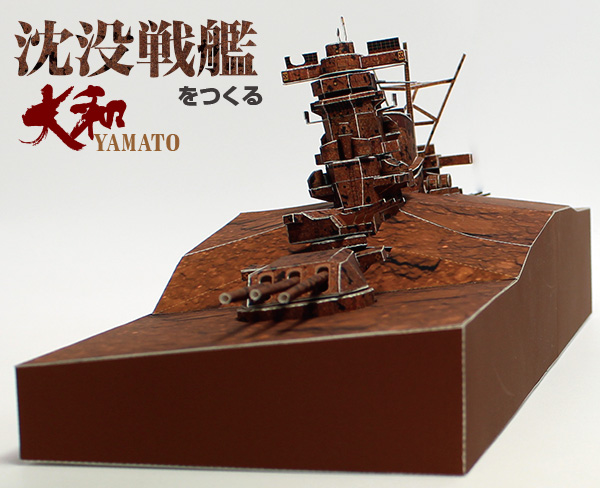 少しだけ未来、干上がった海に艦橋だけ残して佇む赤錆びた戦艦「大和」のジオラマ模型です。この作品はフィクションであり、実際の「大和」の沈没状況とは関係ありません。1/350スケールで、完成時の土台を含めたサイズは幅約30cm、奥行き約21cm、高さ約15cmとなります。全6ステップの詳しい組立説明と共に、無料で展開図を公開しています。