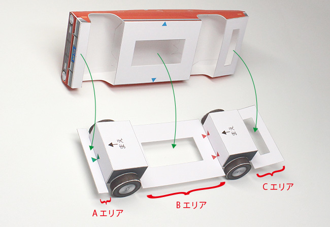 ステップ11でつくったパーツと、ステップ5でつくったパーツを、下図の様に接着します。「Aエリア」「Bエリア」「Cエリア」を段階的に分けて接着するとやりやすいです。