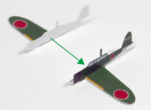 上のパーツを、主翼下面の中央に接着します。このパーツの下側ののりしろを、大和のカタパルトに接着すれば完成です。